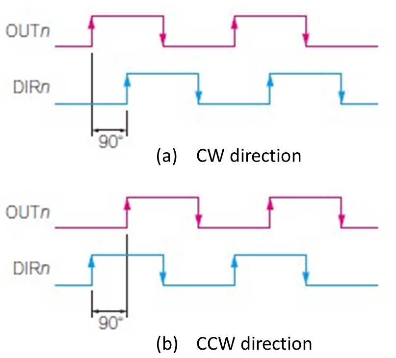 When the output of OUTn pin is 90° ahead in electrical angle compared to DIRn pin output, it indicates CW (clockwise) rotation [Figure 19(a)].