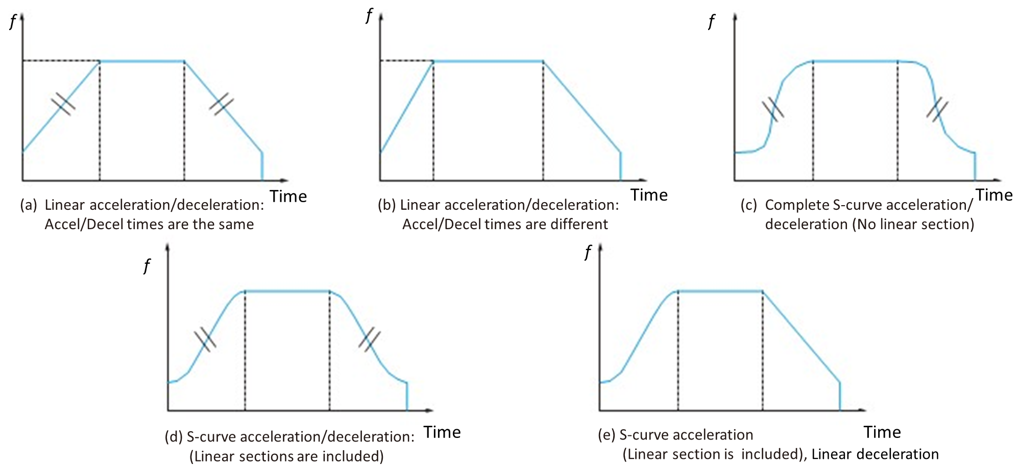 There are various patterns of acceleration/deceleration. In linear acceleration/deceleration, there are patterns where the acceleration and deceleration duration times vary. In S-curve acceleration/ deceleration, there are complete S-curve acceleration/deceleration without linear sections and acceleration/deceleration including linear sections. There are also patterns that combine S-curve acceleration and linear deceleration.