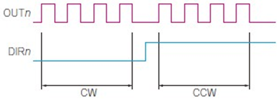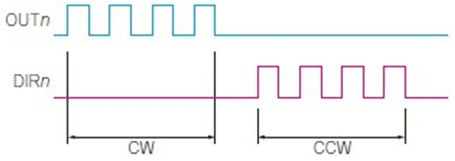 Plus direction pulse signals are output from the OUTn pin, and Minus direction pulse signals are output from the DIRn pin (Figure 18).