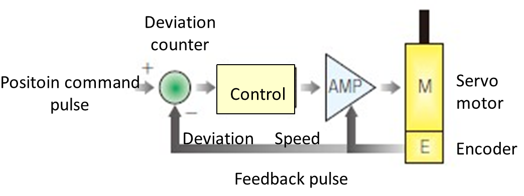 Inside the driver, the deviation counter counts the deviation between the position command pulse and the feedback pulse. When a position command pulse is input to the servo driver, the input pulses accumulate in the deviation counter, and as the motor rotates, the feedback signal subtracts the accumulated pulses in the counter. The servo motor rotates according to the accumulated pulse amount in the deviation counter and stops when the accumulated pulse amount becomes 0 (Figure 21).