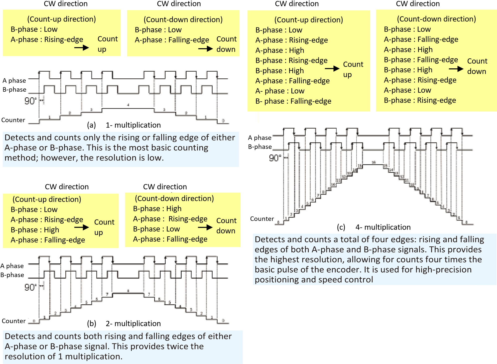 Encoders usually output 2-phase signals (A-phase and B-phase) with 90° phase difference. To accurately detect position and rotation amount using these signals, the counts are extracted using the multiplication processes shown in Figure 23.