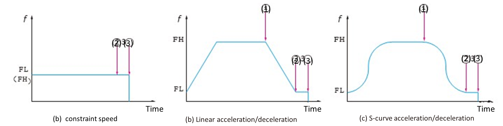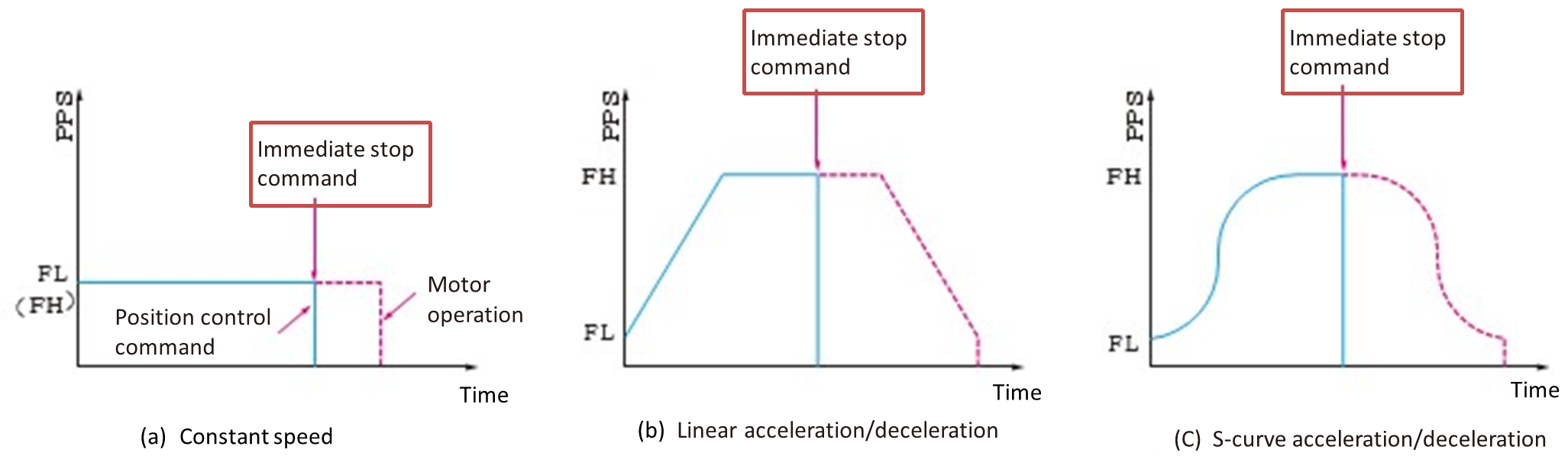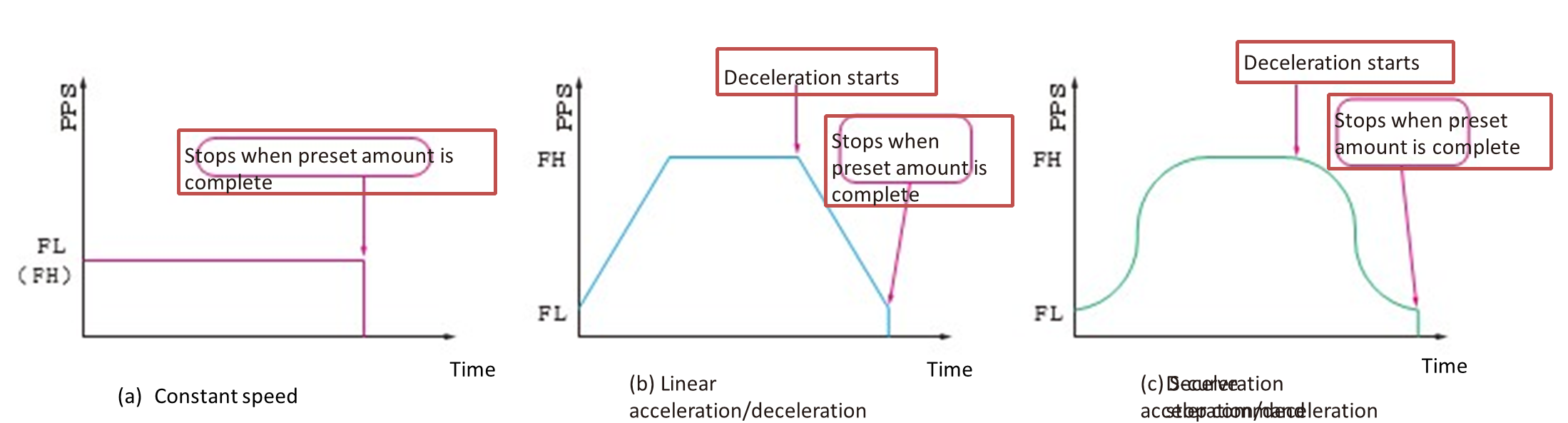 In the case of stepping motors, FL (Frequency Low) speed sets the self-starting area, and FH (Frequency High) speed sets the pulse frequency for self-starting area or synchronous slewing area.