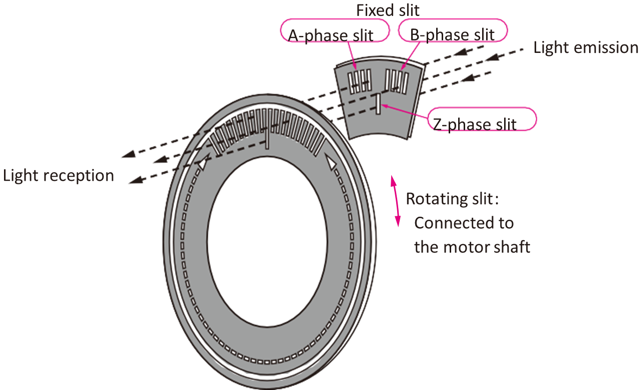When a motor shaft rotates or moves, the light is blocked or passes through these slits, generating pulse signals. Usually, two pulse signals: A-phase and B-phase, are output, and they have a 90° phase difference between them. By detecting the order of this phase difference, the rotation or movement direction can be determined. Additionally, in many cases, there is a Z-phase origin signal that is output once per rotation (or a certain distance).