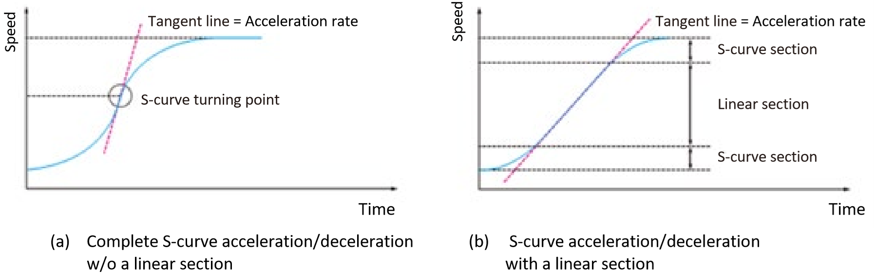 Figure 11 : Comparison of S-curve acceleration/deceleration and S-curve acceleration/deceleration with linear section (Jerk control)