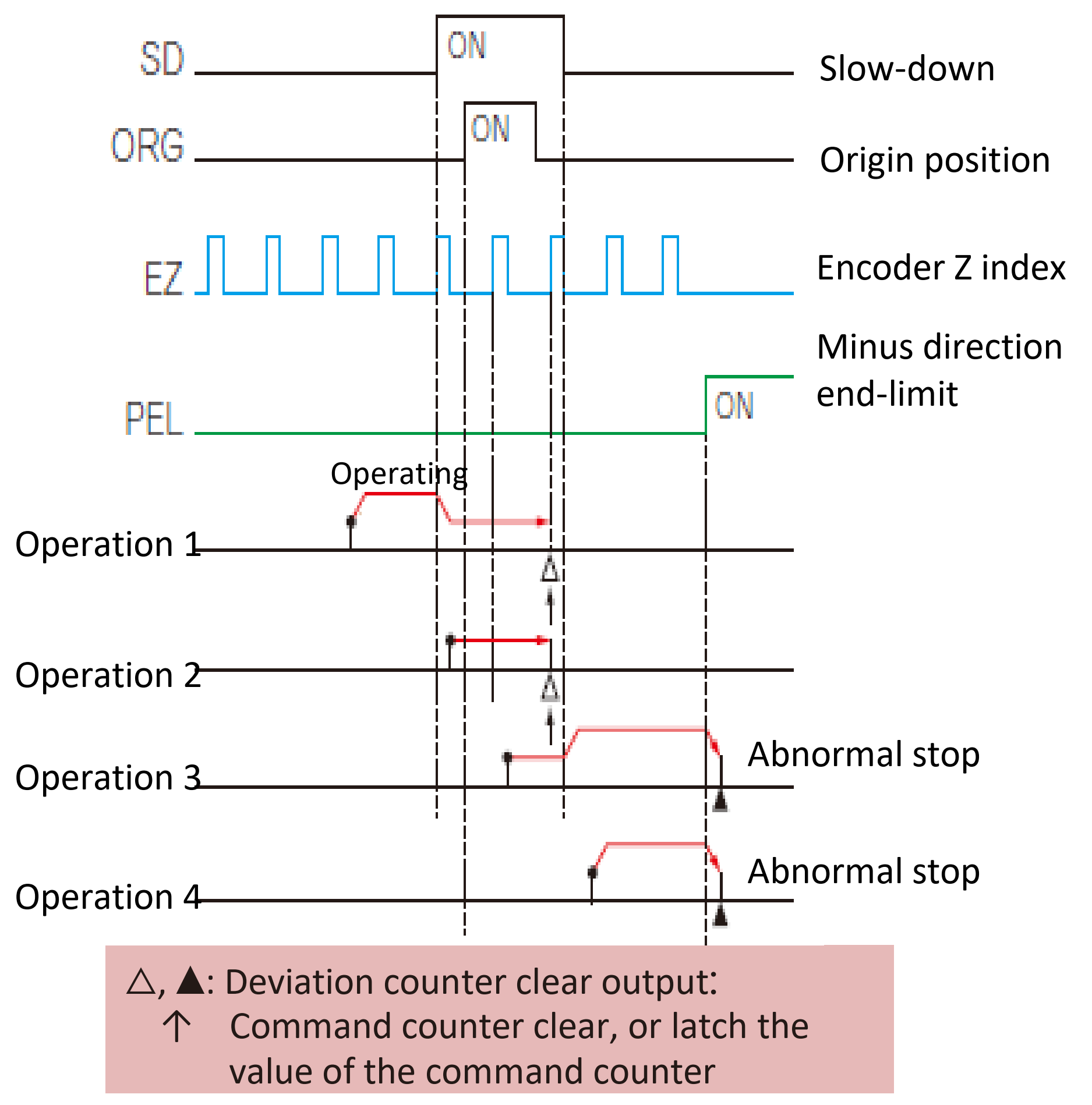 - Origin (ORG) OFF → ON to start deceleration and counting encoder Z-index (2), Stop at Z-index count-up (3)