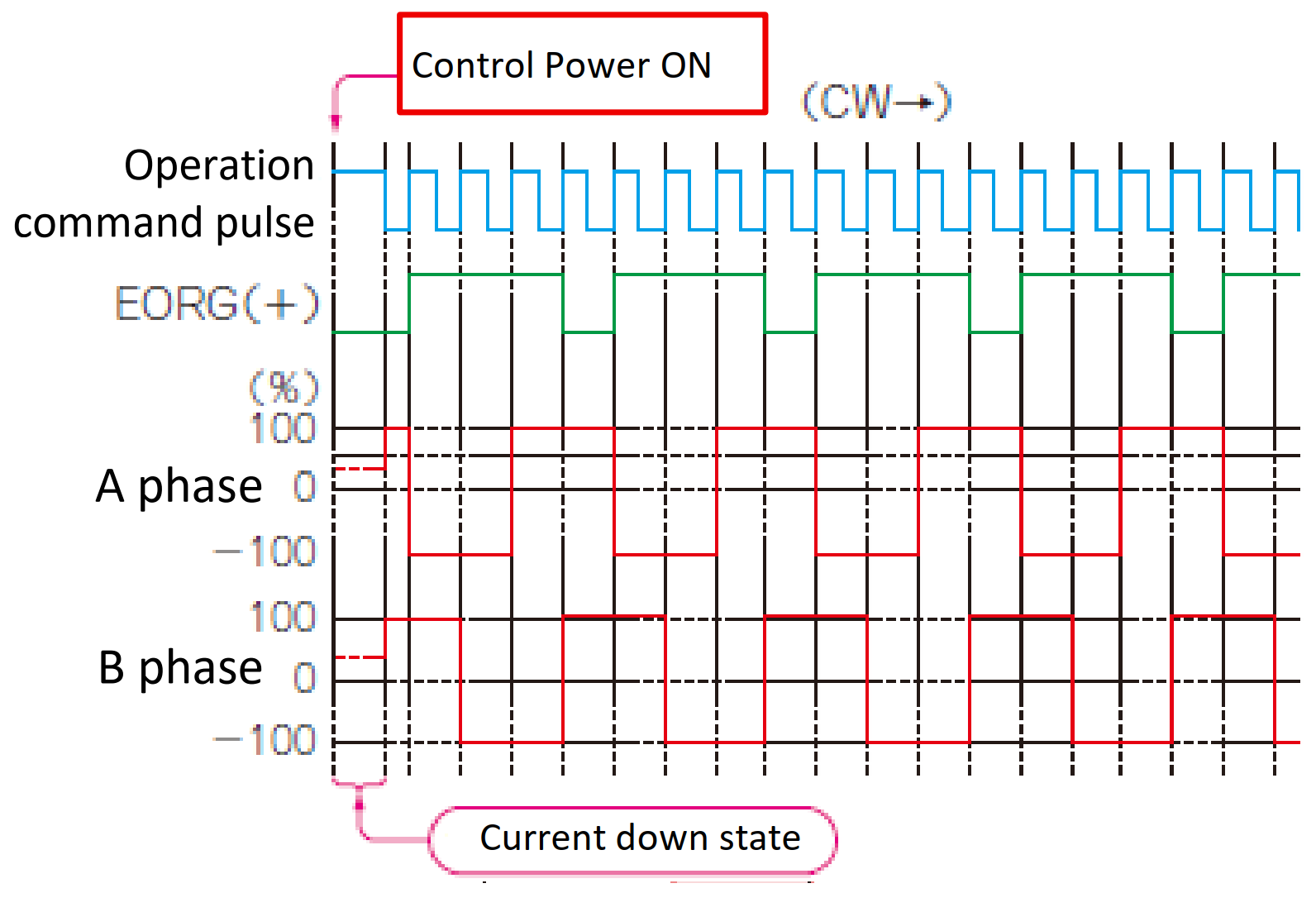 The phase excitation origin output (initial excitation state indicating signal) is useful to ensure more reliable homing; origin return operation, of stepping motors. Stepping motors are driven by switching the direction of current flowing to each phase, and a signal is output each time when this current flow sequence (order) completes one cycle, which is called “Phase excitation origin signal (EORG) “(Figure 27).