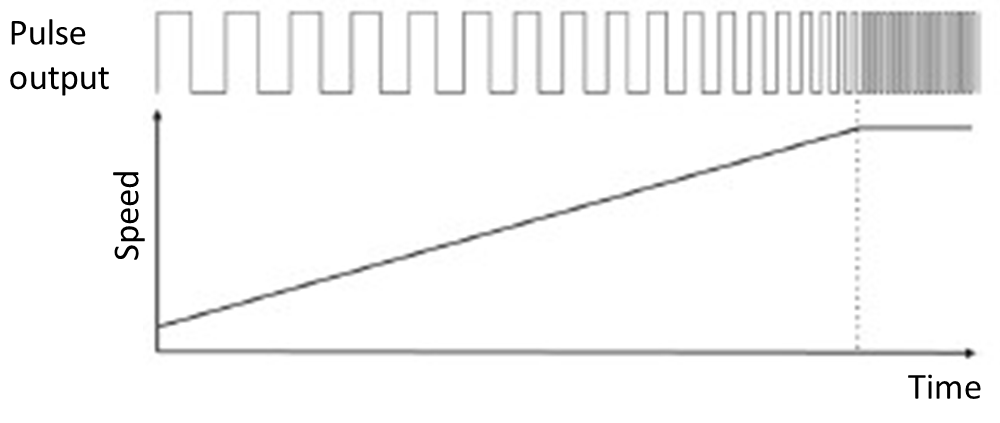 Initially, the pulse frequency begins to increase slowly, then increases at a constant rate. This allows a motor to accelerate smoothly. Figure 3 shows the section where the speed increases linearly.