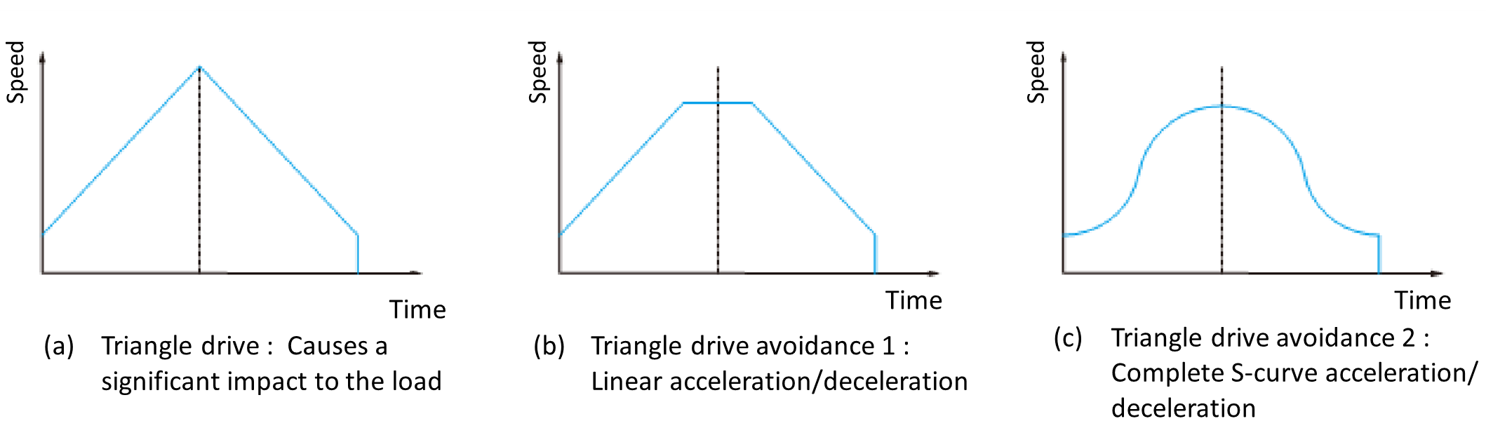 Triangle drives can occur when FH (Frequency High) speed is too high relative to the feeding amount, or when the feeding amount is too small relative to FH speed. This drive causes a sudden rotation change toward deceleration during acceleration, delivering a significant impact to the load. To avoid this, triangle drive avoidance function is used. (Figure 12).